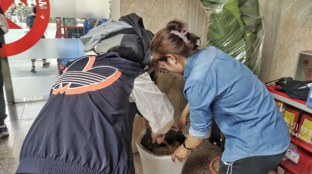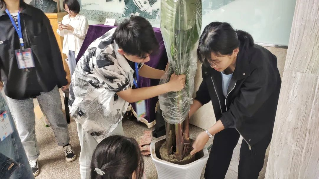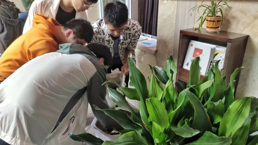 仪式开始,每组同学代表对相应植物的特点、习性、寓意进行介绍,并表达了自己期待绿植枝繁叶茂、茁壮成长的美好心愿,随后各小组依次领取对应的植物并合影留念。甘霖老师对此次活动的深刻意义进行了阐述,进一步号召同学们要德智体美劳全面发展,做有文化素养和实践能力的唐臣青年。这些绿植不仅仅是低碳绿色的代表,也是唐臣师生情谊的见证。最后,同学们和老师们一起将绿植种植下去,同学们先将花盆里的旧土铲松,放入营养土,再小心翼翼的将植株移植到盆里并填好土,最后在认领的绿植上挂上介绍和寄语卡片。每组同学互相协作,用一盆盆绿植让书院环境焕然一新,生机盎然。