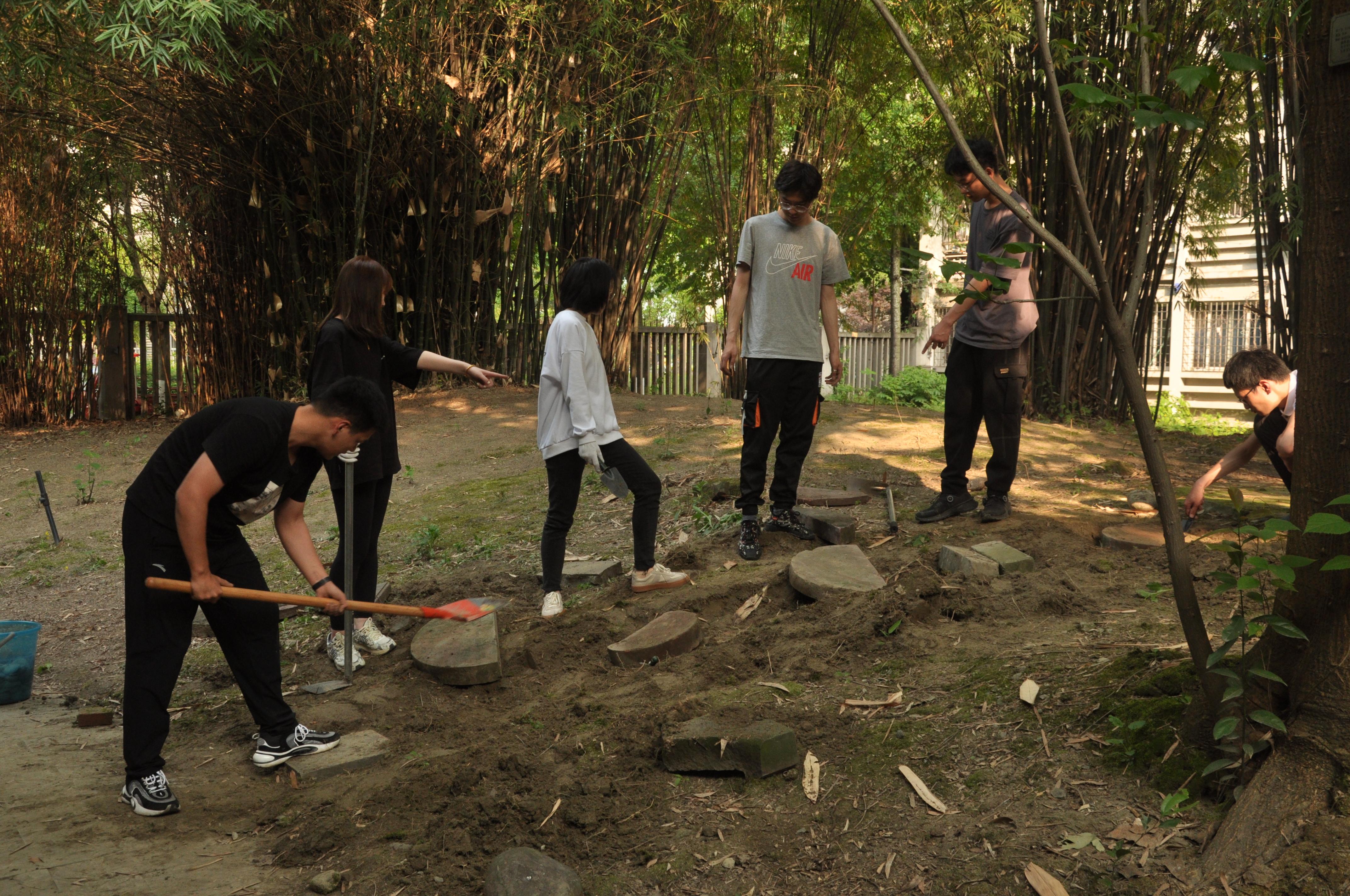 由于每个小组铺设小径各有不同,所需解决的问题也不同,同学们身体力行,集思广益,积极完善本组的小径铺设方案,就地取材,利用书院周边的建筑边角料来铺设小径。有同学负责挖掘小路雏形、有同学负责捡拾鹅卵石、有同学负责清理青苔、有同学负责搬石板……大家合理安排,分工合作,忙得不亦乐乎、乐在其中,材料收集和路径开凿同步进行,大大缩短了铺设所需时间。随着时间的推移,小径初具雏形,尽显同学们的审美力和创造力。