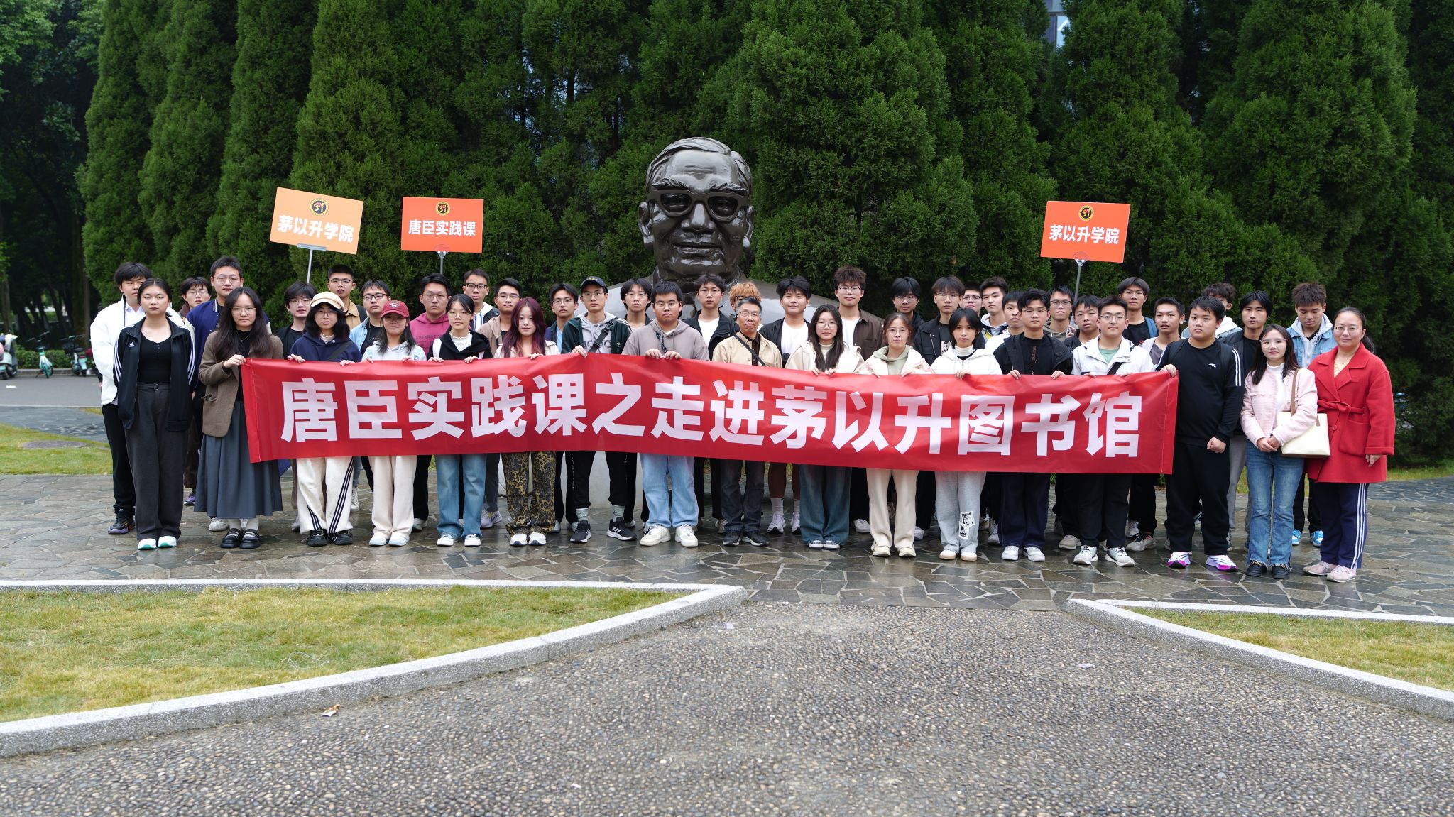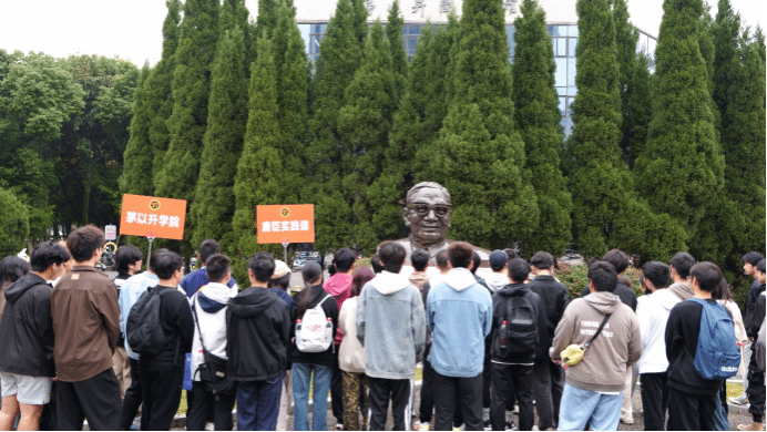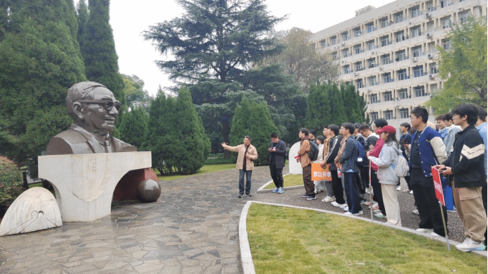 实践课从茅以升先生的铜像前开始。这座铜像由著名雕塑家叶毓山先生雕刻,庄严地矗立在茅以升图书馆前广场,是全国首座以茅以升为主题的雕塑,也是纪念茅以升先生的文化地标。陆定一先生亲笔题写的“爱国知识分子的楷模”镌刻在基座上,这八个字不仅是对茅以升先生一生精神的精准概括,也深深触动了在场的每一位同学。