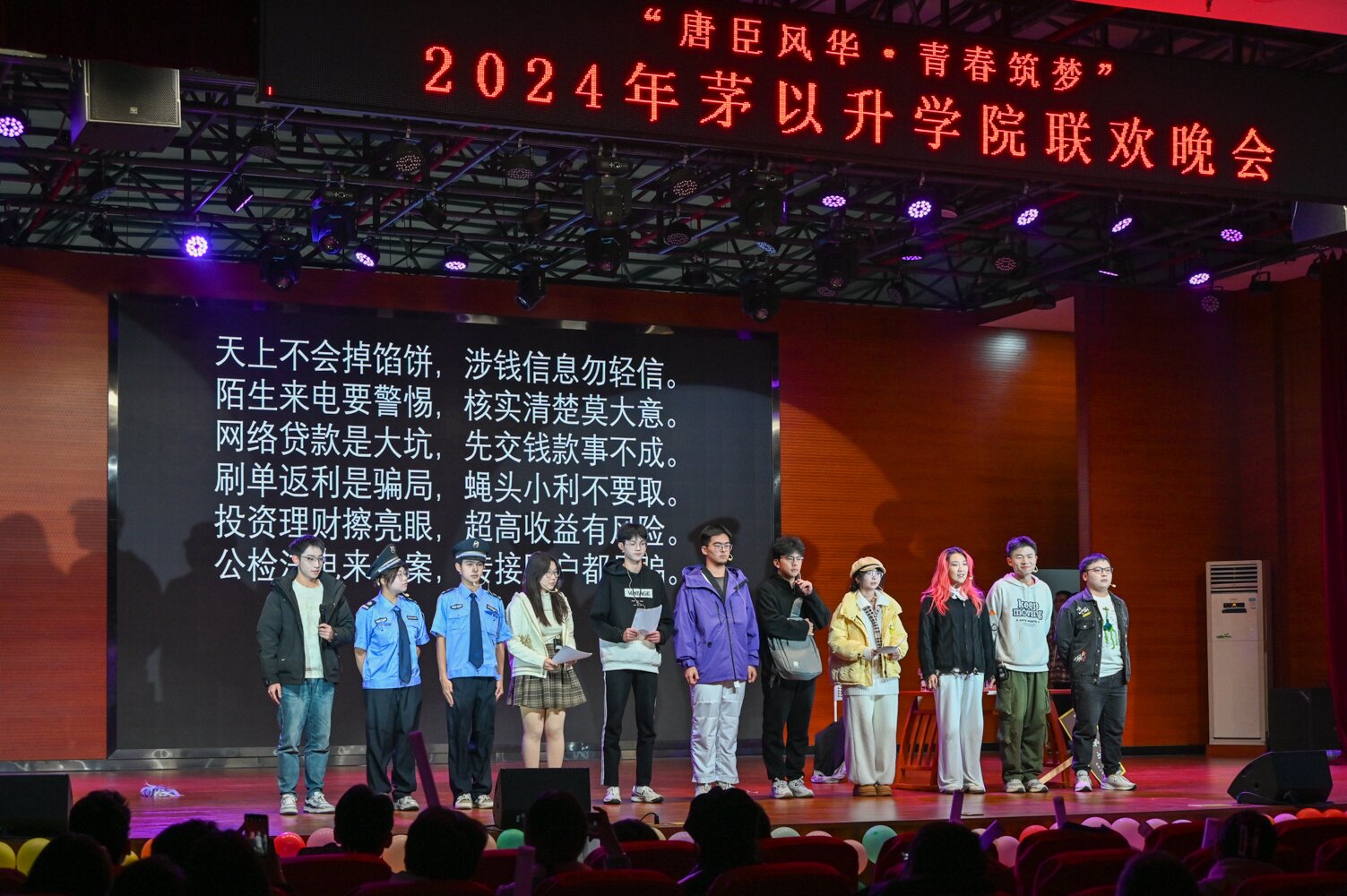 自我管理委员会的合唱《CITY OF STAR》旋律优美,情感真挚;材料科学与工程专业茅以升班的《稻香舞韵》则唤起了对纯真岁月的怀念,传递了珍惜当下、勇敢前行的正能量。此外,建筑专业茅以升班的小品《诈骗风云》也以其独特的视角警示同学们要严防诈骗陷阱,确保安全的大学生活。最后,全体师生合唱《我和我的祖国》,将晚会氛围推向了最高潮,表达了对伟大祖国的深情厚谊。