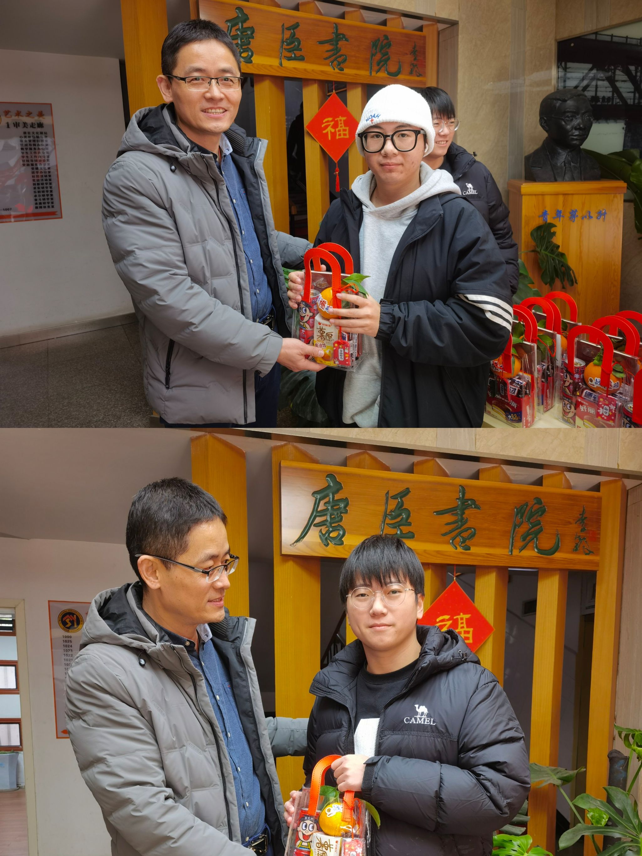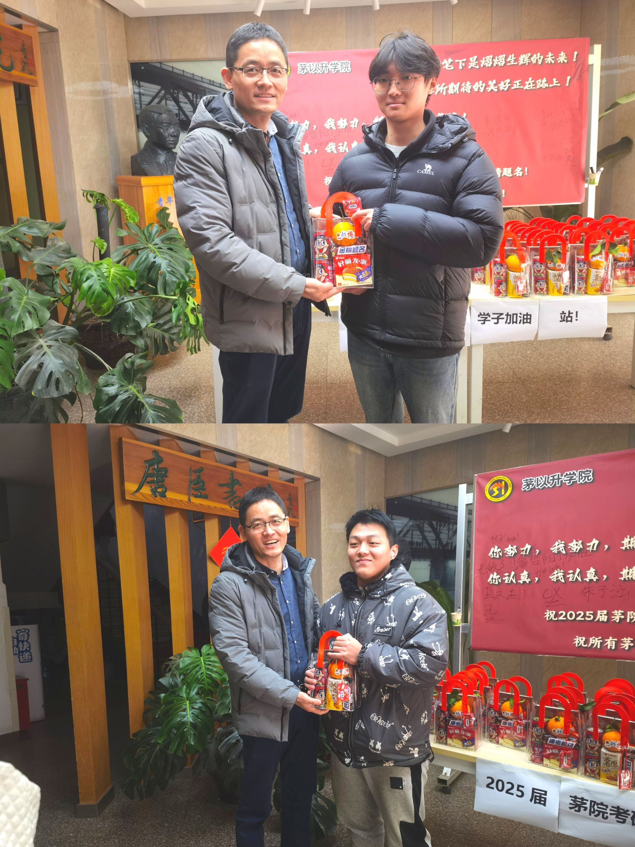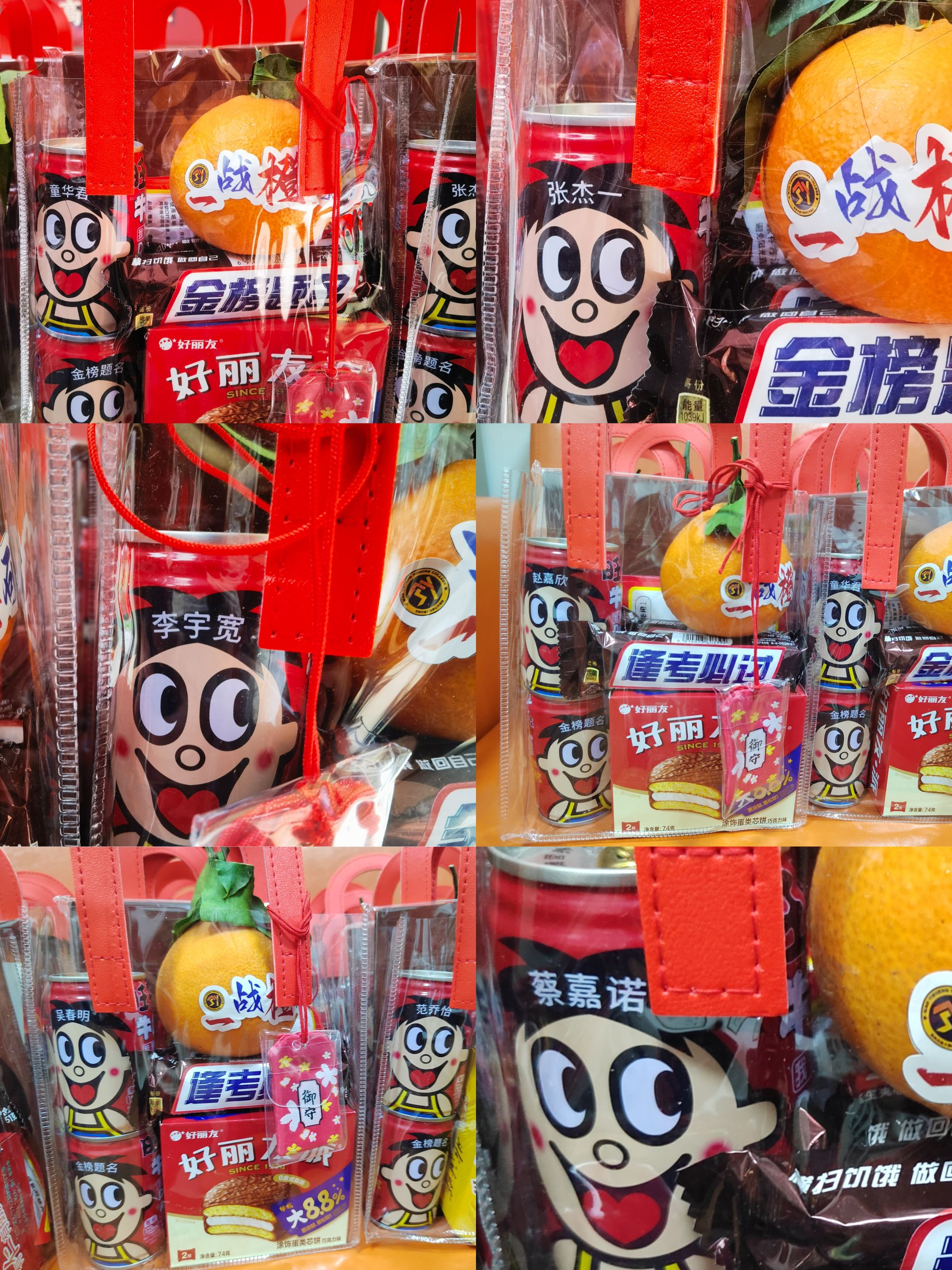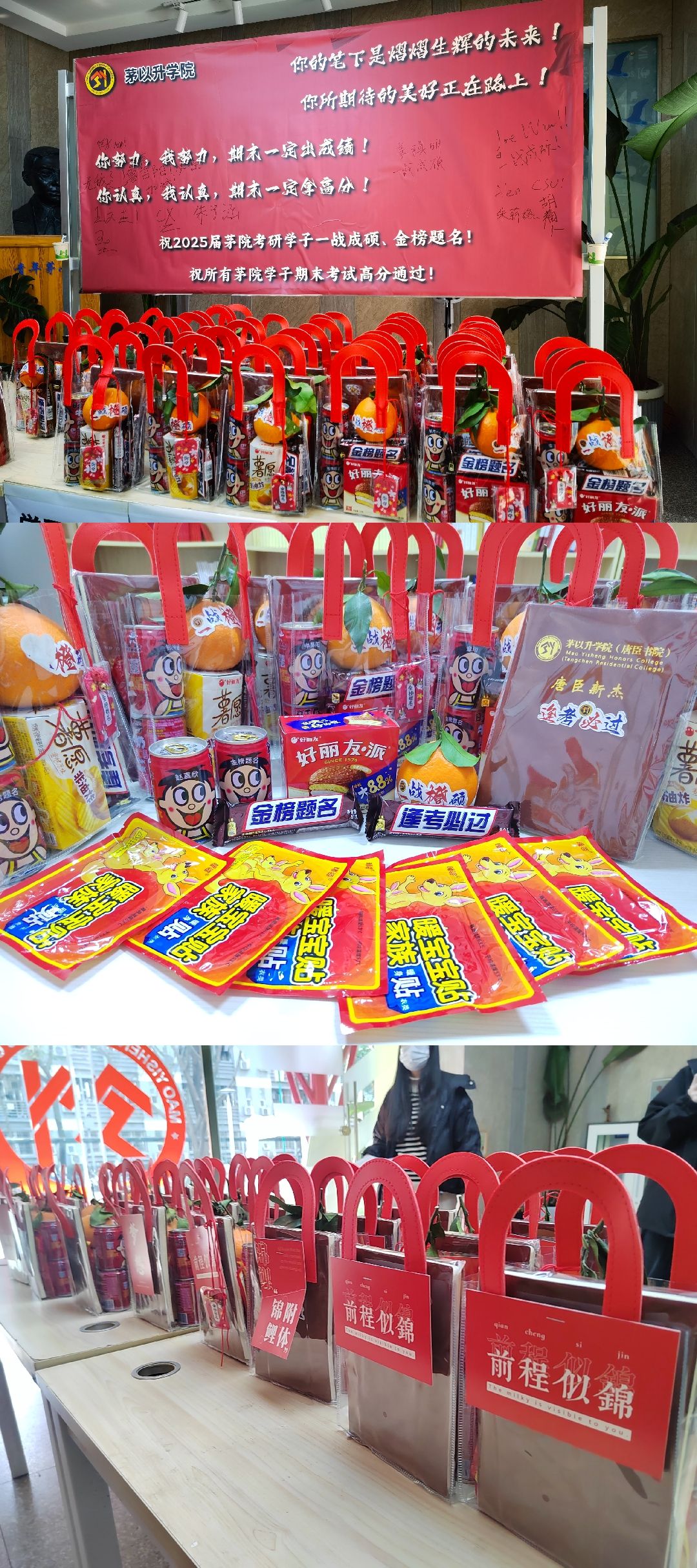 特别定制了“考研加油包”,每一份礼包都蕴含着学院对学子们的美好祝愿。礼包中,不仅有设计精美、寓意金榜题名的明信片,鼓励学子们以笔为剑,书写辉煌;象征着一战“橙”硕的橙子,寓意着每位考生都能心想事成,收获满满;更有刻有每位考生专属姓名的旺仔牛奶,寓意着学业旺旺,精力满满;考虑到冬季寒冷,学院还贴心准备了暖宝宝,让学子们在紧张的备考中也能感受到来自学院的温暖与关怀,真正做到了暖身更暖心。