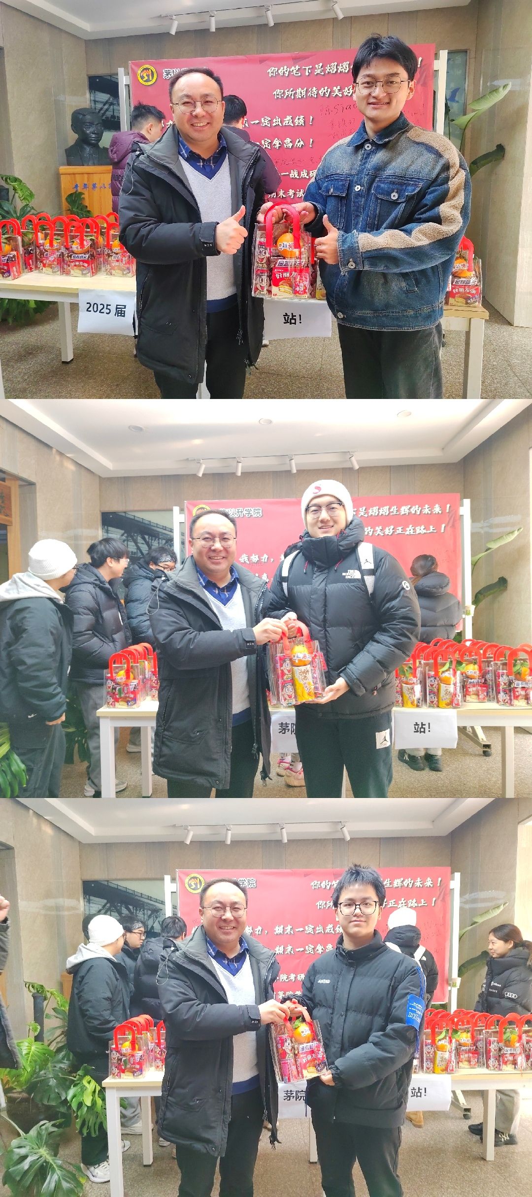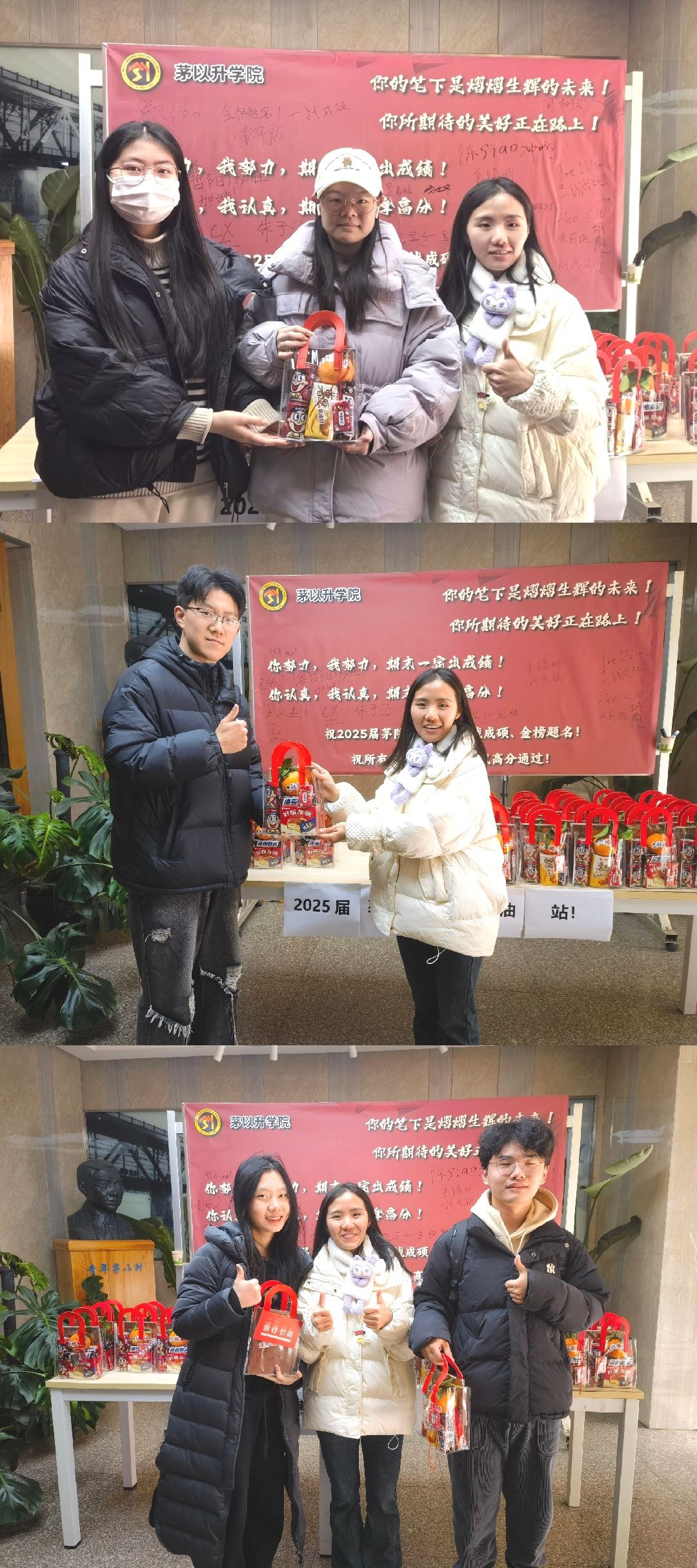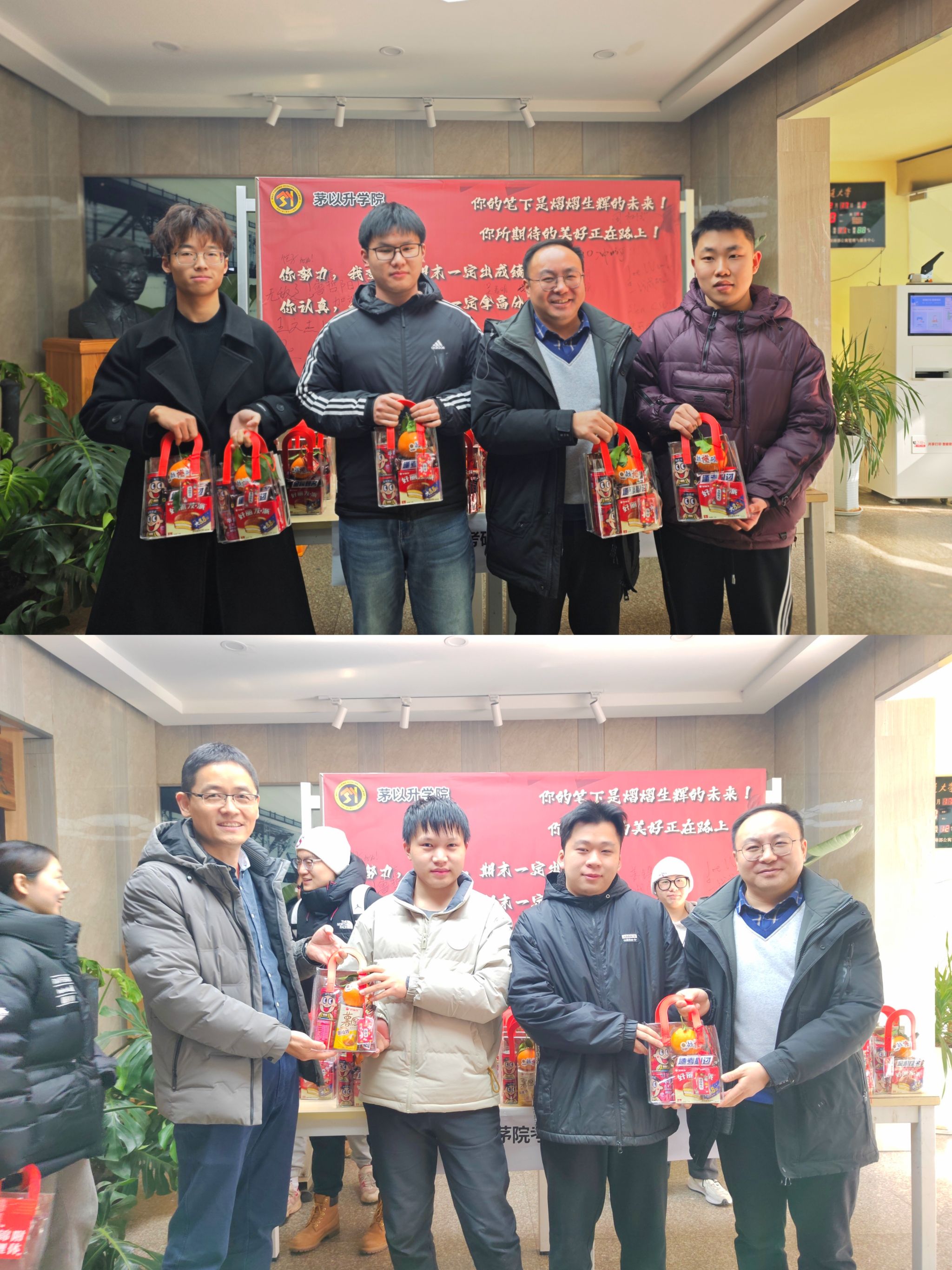 党总支书记李毅、副书记杨宏毅、辅导员康志娟共同参与,他们带着满载祝福的“考研加油包”,为每一位考研学子送上最诚挚的祝福与鼓励。