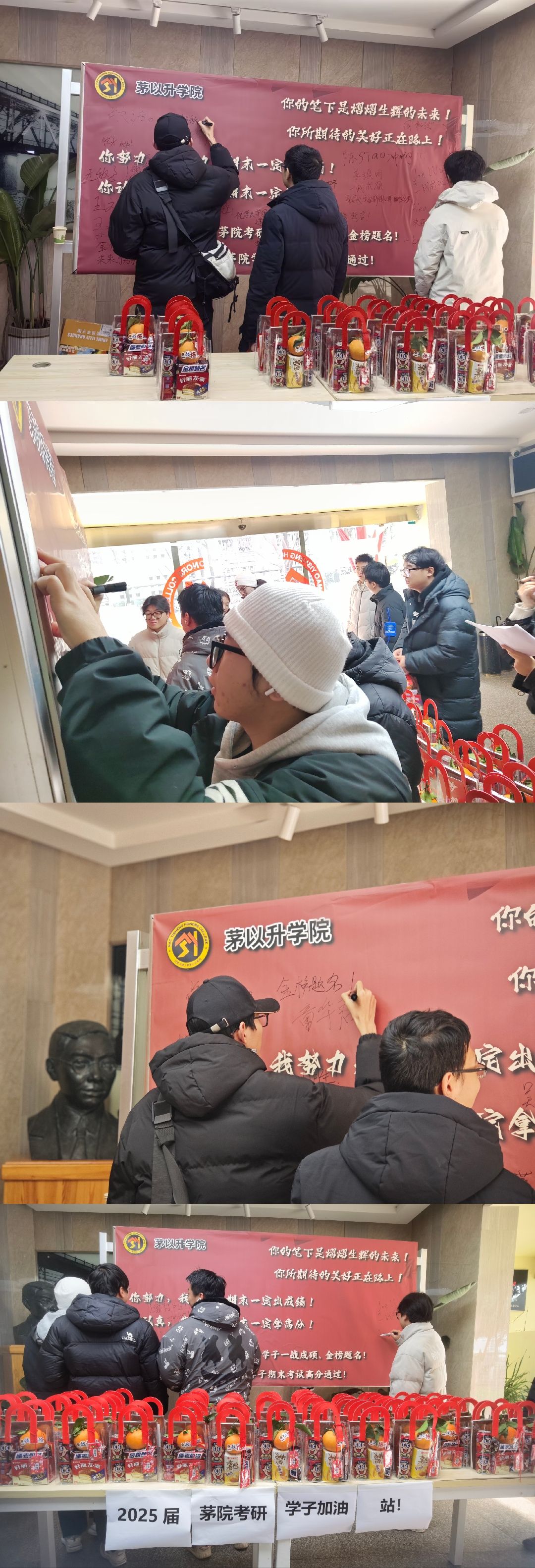 李毅和杨宏毅亲切地与考研学子交谈,亲手将“考研加油包”送到每位学子手中,询问他们的备考情况,鼓励他们保持积极心态,勇敢面对挑战。学子们接过礼包,纷纷在考研加油海报上签名留言,脸上洋溢着感动与喜悦。
