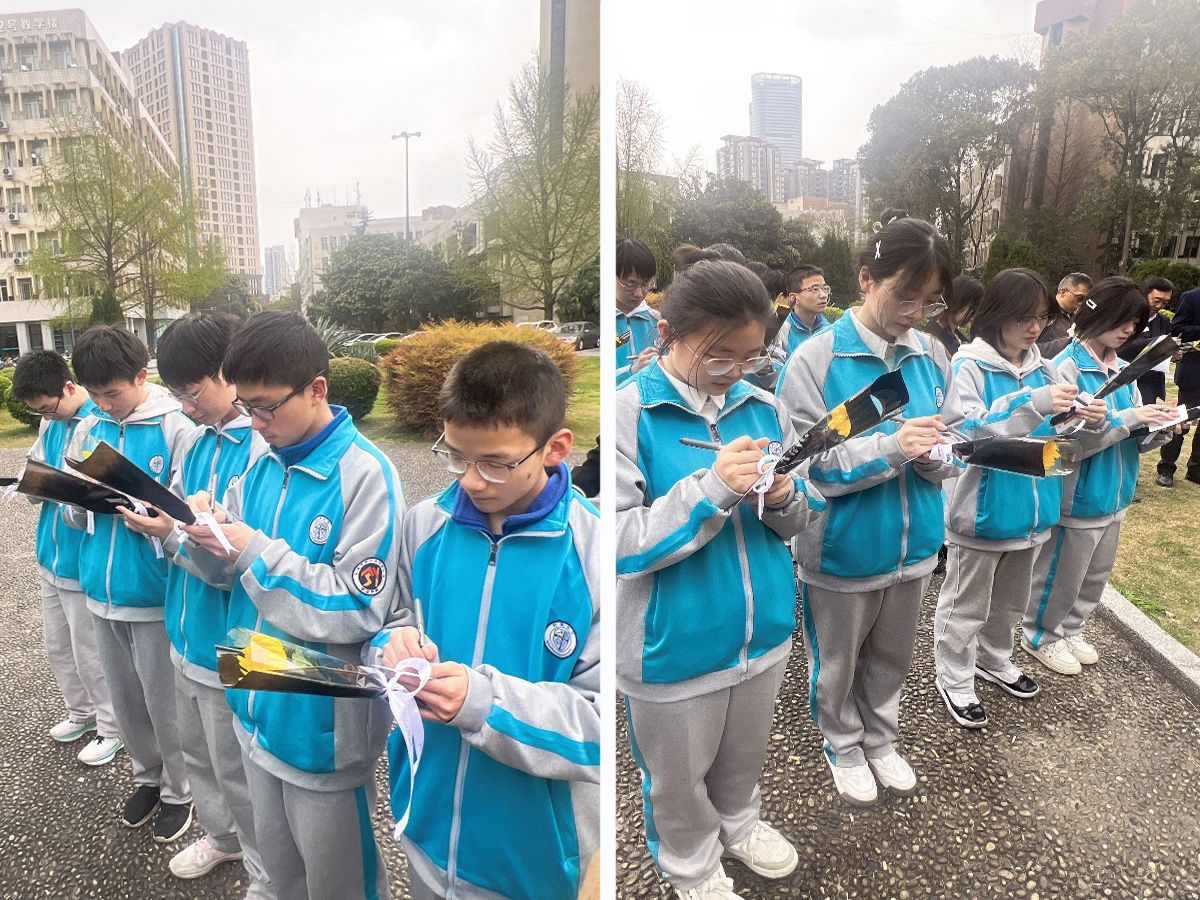 家国又清明,鲜花寄哀思。全体师生在方寸留言卡上书写下对茅老的深情寄语和厚重的感悟,列队缓步上前,将饱含敬意的小黄菊轻放于雕像基座,深深鞠上一躬,默默缅怀茅老。墨香与花香交织,娟秀的笔迹与伟人的雕像辉映,共同完成一场跨越百年的青春应答。