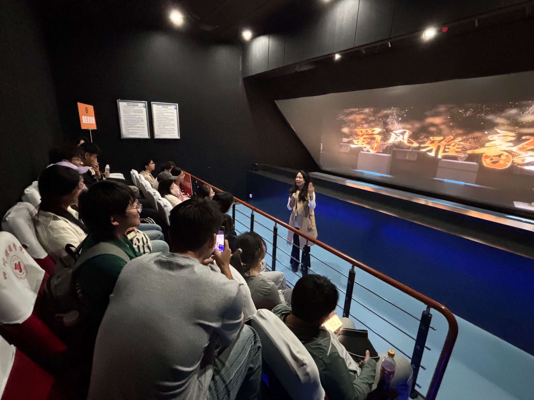 第一环节,同学们在虚拟现实视听技术创新与应用国家广播电视总局实验室学习。该实验室围绕超高清和虚拟视听技术在广播电视和网络视听领域的融合应用,正全力推进虚拟现实创新应用方面的重点工作,开展关键技术研究,推动技术成果转化和实现创新应用。重点探索裸眼3D虚拟影像制作、8K VR内容拍摄制作、XR虚拟棚摄像机追踪及虚拟互动、数字虚拟抠像及实时合成、AI技术辅助虚拟视听制作全流程等领域。形成的科研成果广泛应用于广播电视、网络视听、文旅、文博、文创等多个行业。同学们还集体观看了视频作品《蜀风雅韵》。