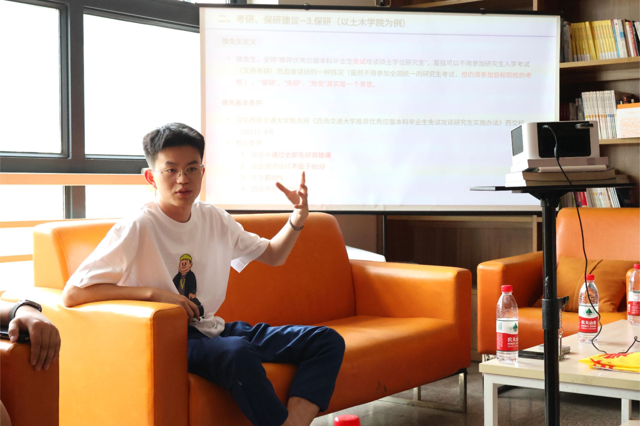 分享会上,王晓波从个人情况、保研考研的详细介绍、给学弟学妹们的建议三大板块展开讲述。他首先分享了自己在大学阶段的成长经历,凭借出色的能力与不懈的努力获得保研资格,如今在西南交通大学 “极端环境岩土和隧道工程智能建养全国重点实验室”攻读硕士学位,师从何川院士。以自身经历为引,他着重强调了大学阶段明确奋斗目标的重要性,“作为大学生,应该清晰地知道自己以后要干什么”。