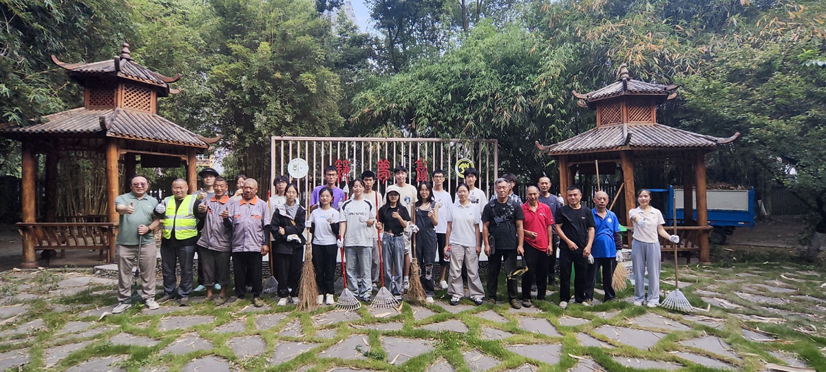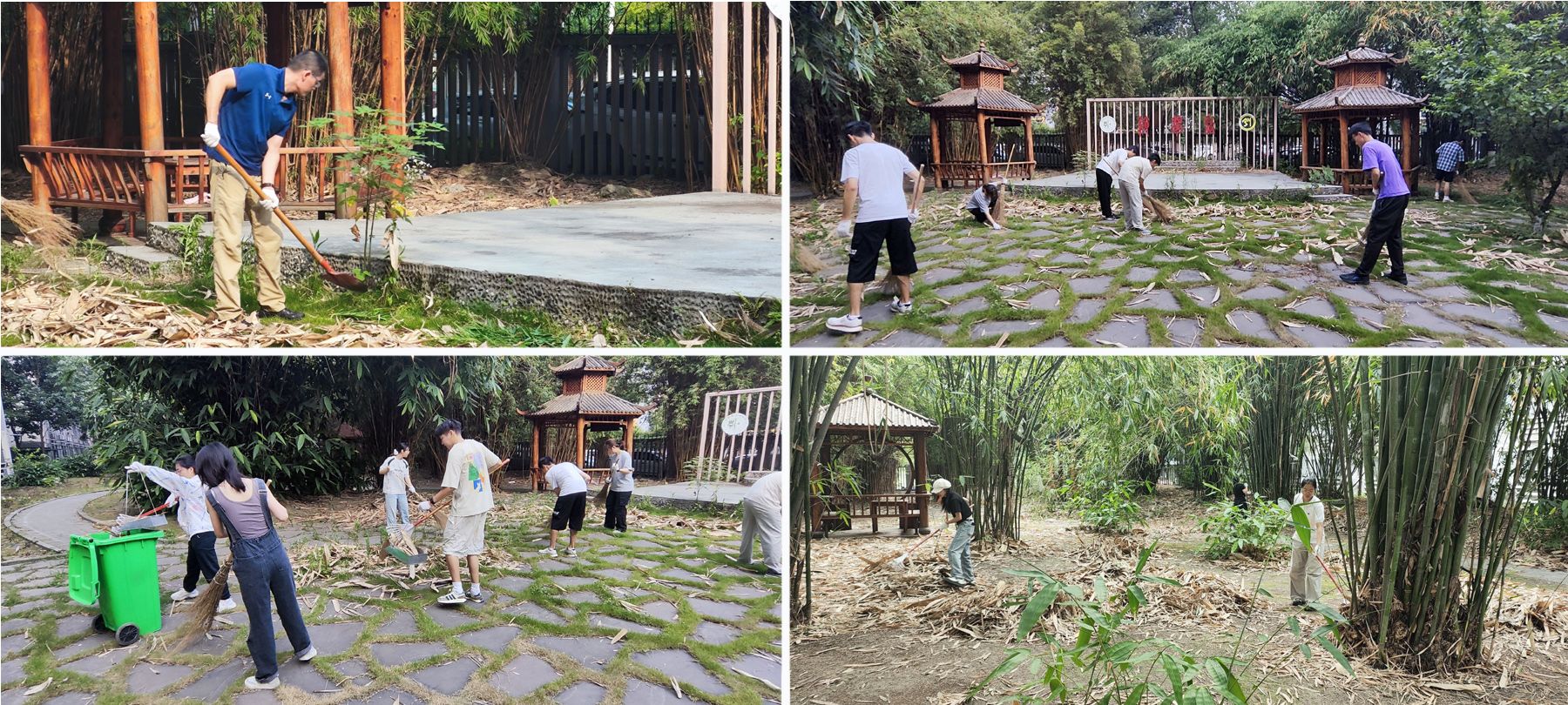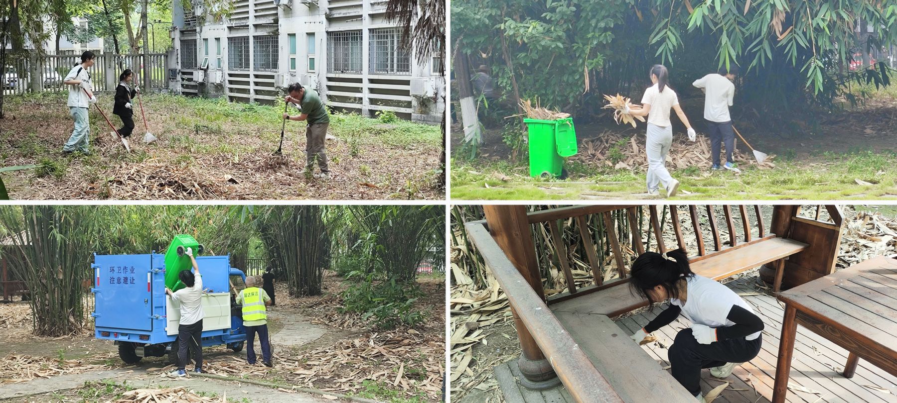活动现场,茅院师生与后保部工作人员分工明确、配合默契。大家手持扫帚、簸箕、除草机等工具,穿梭在筑梦园的各个角落。老师和学生们仔细清扫地面的落叶,将其归拢成堆后,装进垃圾桶;后保部工作人员负责将装满落叶的垃圾桶及时拉走,保障清理工作高效推进。闷热的天气里,汗水浸湿了衣衫,却浇不灭大家的劳动热情,每个人都专注于手中的工作,不放过任何一个卫生死角,换来筑梦园的焕然一新。