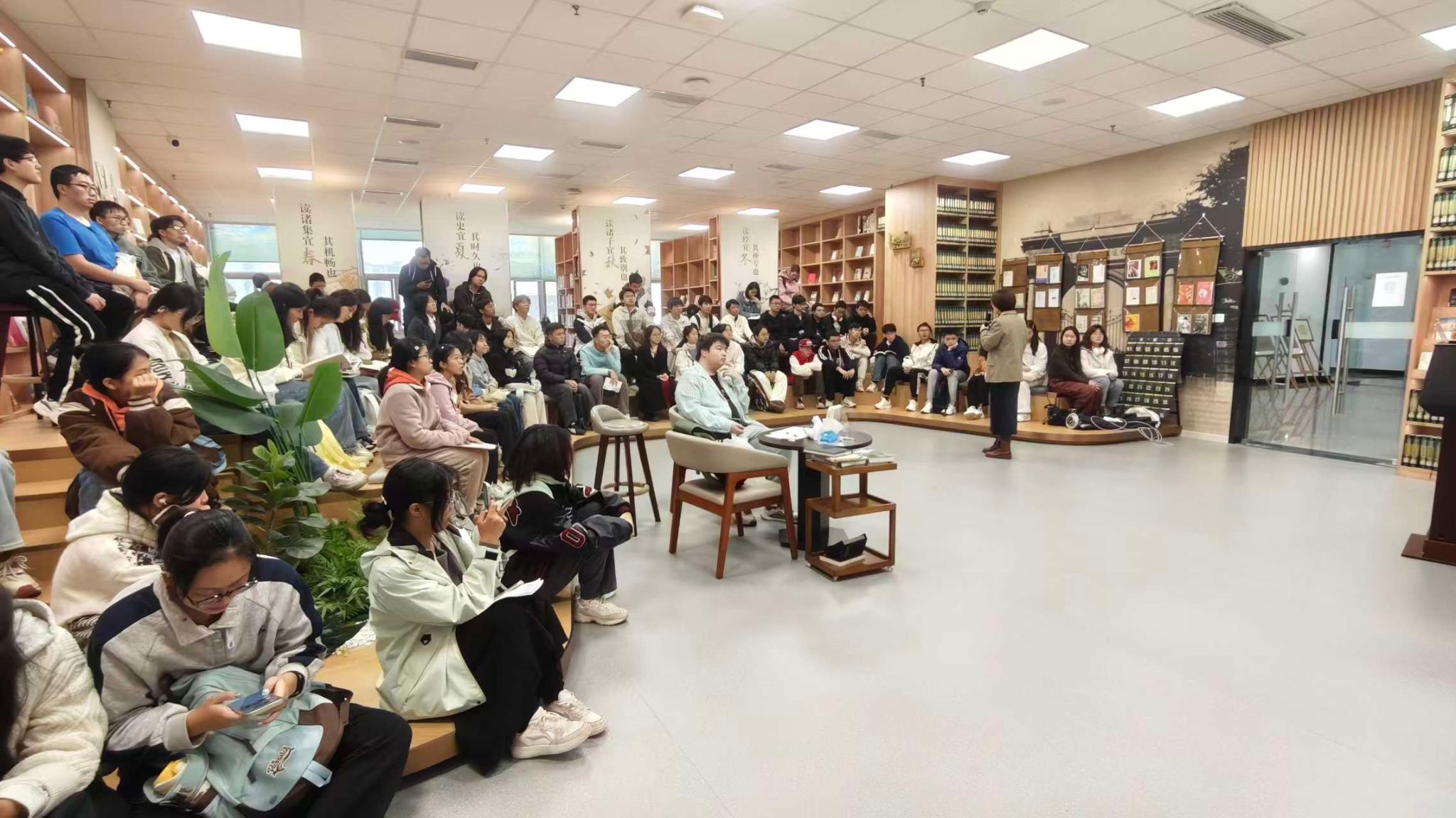 讲座过程中,师生们专注聆听,认真记录要点。在互动交流环节,同学们积极提问,就“经典阅读与专业学习的平衡”等问题与刘老师深入探讨。