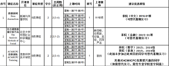 2、关于暑期实习替代:1)茅院(金融)2015-01班、茅院(中文)2016-01班、2015级、2016级信息班和数学班未参加过此项目的学生如选择上述建议课程已获得专业学院批准同意课程替代。2)其他专业学生选课如需替代实习,需经专业学院签字同意。3)申报北京大学暑期学校项目未经专业学院同意替代暑期实习的,作为自愿参加项目,返校后需补修学校安排的暑期实习。