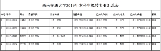 根据《西南交通大学本科生转专业管理办法》文件规定和西南交通大学茅以升学院2019年转专业的整体工作安排,经学生本人申请,学院考核,拟同意以下同学转入相关专业学习,并将相关事宜通知如下: