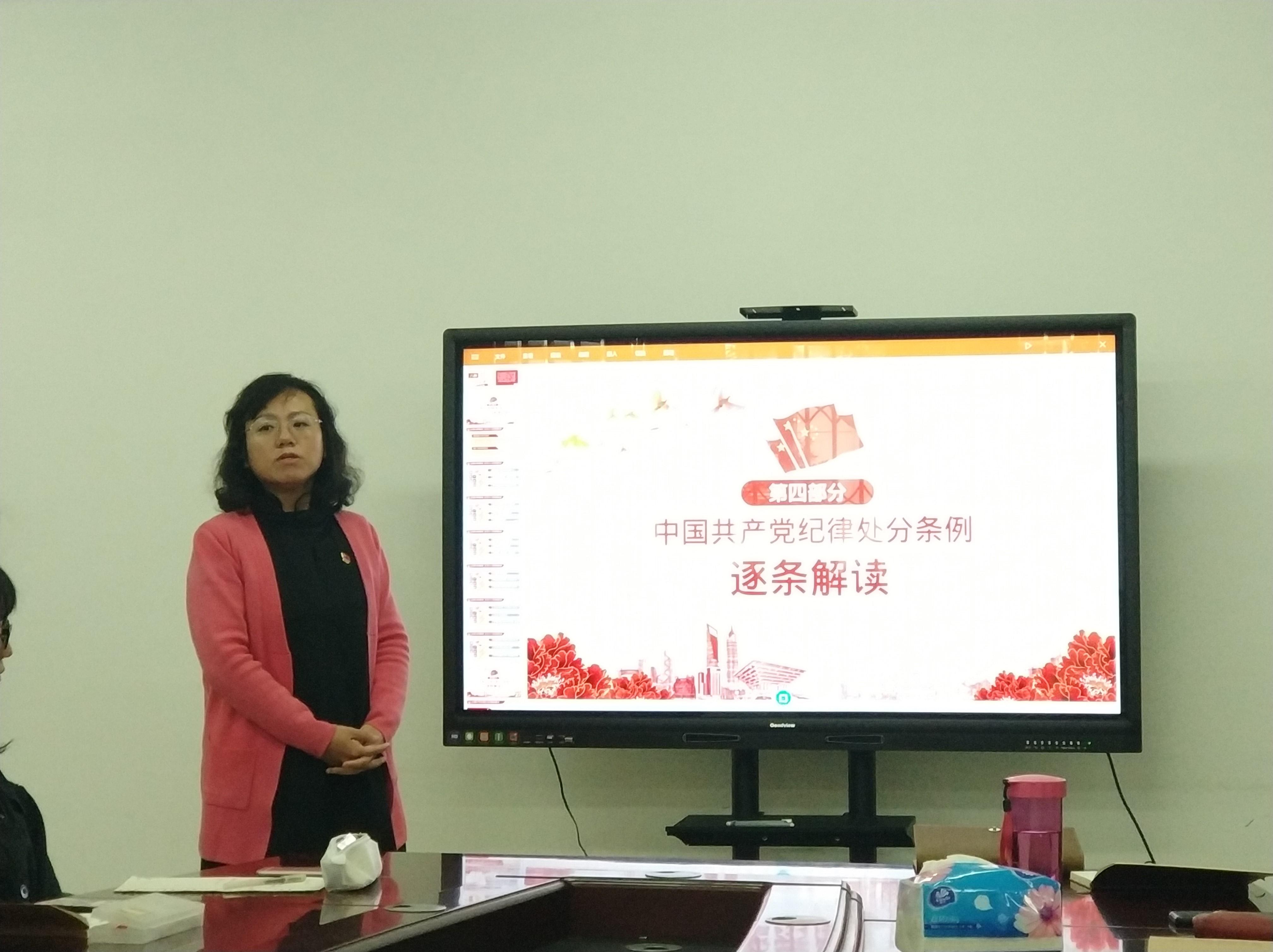 随后,围绕2018版《中国共产党纪律处分条例》的主要内容,王霞副书记从纪律处分条例的意义及要求、条例的八大亮点、条例中的十八项纪律高压线等多个角度进行了深入的讲解,使与会人员充分认识理解新版《中国共产党纪律处分条例》的深刻意义与内涵。
