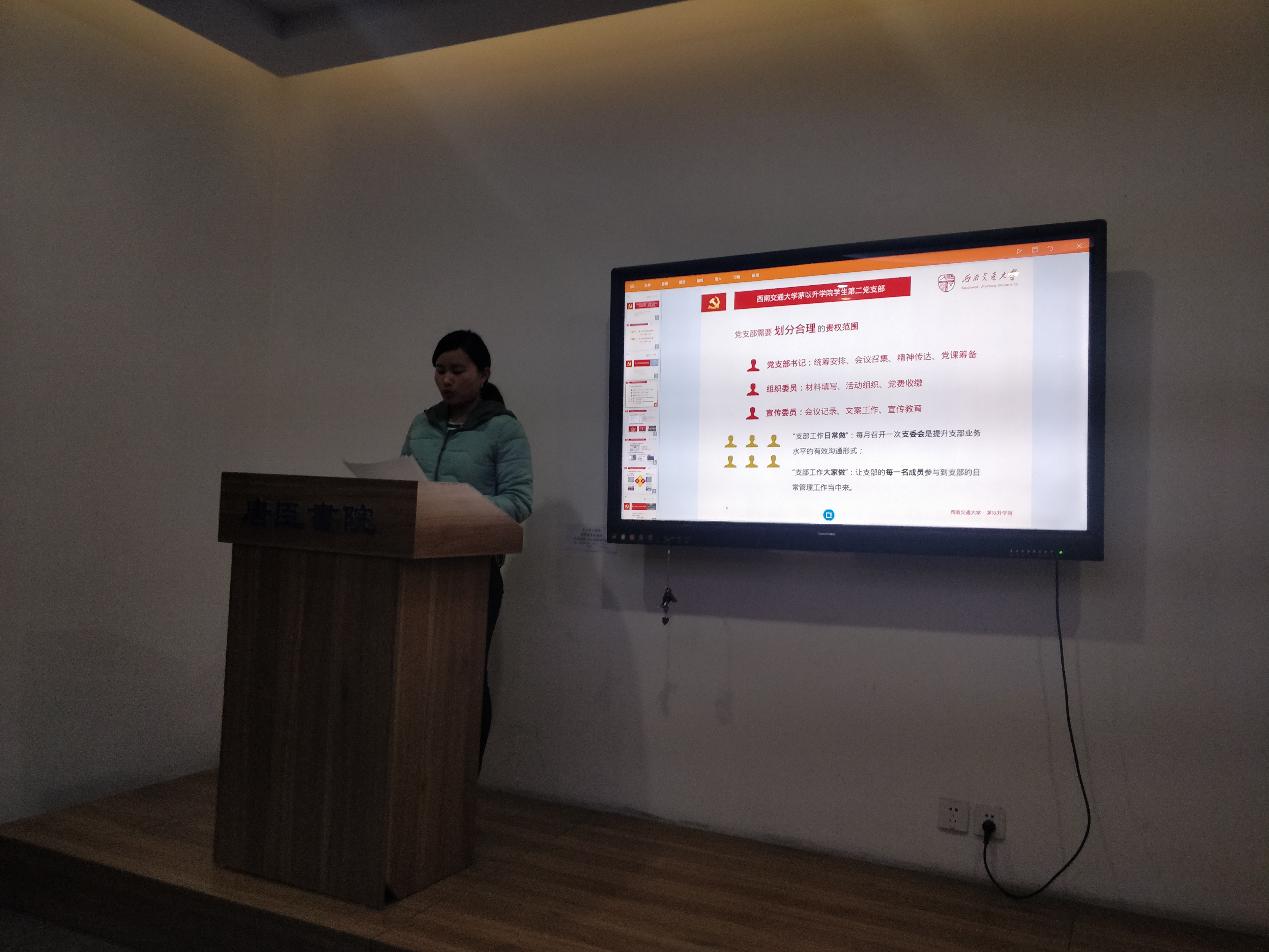 首先由党支部书记张颖对组织学习进行了安排,接着对党支部工作进行了支部述职报告。在报告中,张颖书记从党支部日常管理和党支部活动开展这两方面进行了述职。