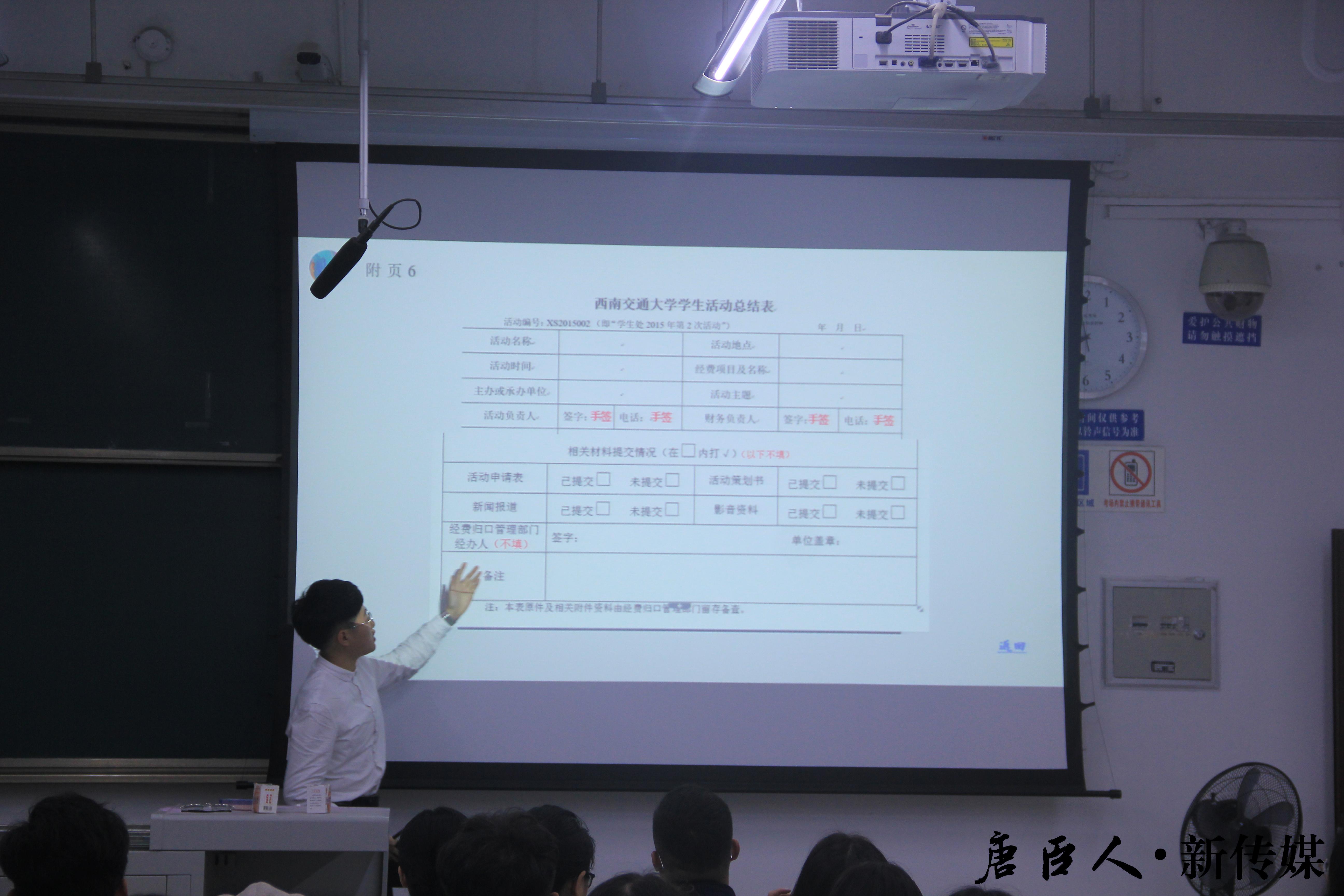 在讲座正式开始前,雷老师首先向各位团学干部强调了本次讲座的重要性,希望大家都能认真学习财务管理知识,增本领、长才干。随后,计财处工作人员对计财处概况及各项活动或项目的报账方法进行了介绍。计财处位于西南交通大学犀浦校区综合楼一楼123办公室,是学校的财务管理部门,是学校唯一的一级财务机构,也是与会计专业联系最为密切的校内机关部门。计财处共有六个部门:会计核算中心、科研经费及应税管理科、会计电算化科、综合财务管理科、收入管理科、后勤财务管理科。每个部门都各司其职,各履其责,负责的报账内容也并不相同。大多数活动的报账都有一个共性的流程,但具体到某一特定活动还是不尽相同。