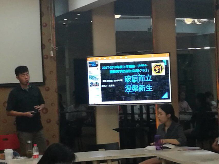 首先,班长王宗为以“破后而立,涅槃新生”为班会奠定了基调。班长先开门见山地阐释了了“破后而立”的含义:交运班既有新鲜血液融入大集体的“有形的打破”,又直言不讳的指出有班级上学期两极分化较严重敲响的警钟的“破碎”;不过班长很快就用“涅槃重生”将班会拉出略微沉重的气氛,通过重温我班上学期优的秀学习,与课外活动成绩,结合茅院特色化的培养计划,为我们注入了新学期的活力与信心。