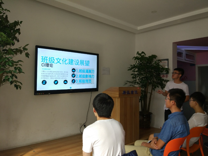 它包括三个子系统:企业视觉识别系统(VI)、企业行为识别系统(BI)、企业理念识别系统(MI)。李增辉同学认为班级管理与企业管理有相似之处,并就此提出了自己的想法。他认为对内的班级理念识建立别应该从培育班风,加强学风两方面进行。而对外的行为识别则需要班委同学的共同配合,班级视觉识别则需要从班徽、班级标准色、班级标准字等方面入手。三方面缺一不可,最终达成班级文化建设的目的。