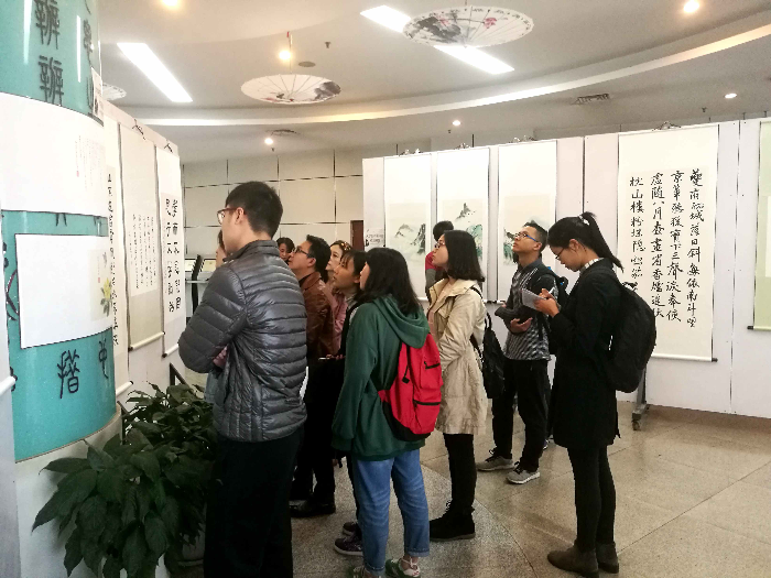 最后,同学们走过了挂满中国传统名画的长廊,参观了西南交通大学大学生及教职工书画协会作品展。舒老师通过对《清明上河图》等历史名画,及黄庭坚与林风眠等大家的介绍,让所有人重温了中国传统书画的意蕴。在书画展里,舒老师以书法作品为例,从或苍劲或连贯的笔法中,为同学们解读出“形断神连”和“笔断意连”等哲学思想。