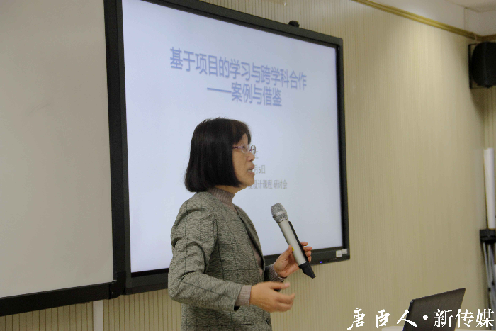 会议第一环节为专题报告。首先由范怡红教授就跨学科合作方面进行报告。范怡红老师从职场需要什么样的人才入手,阐释为什么要进行跨学科合作。范老师认为,应该努力将学生们培养成为“T”型人才:既有专业深度,又有广博的知识面。随后,范老师讲解了基于项目的教学内容、特点、流程,并通过举例说明跨学科融合在实践中所取得的成果。