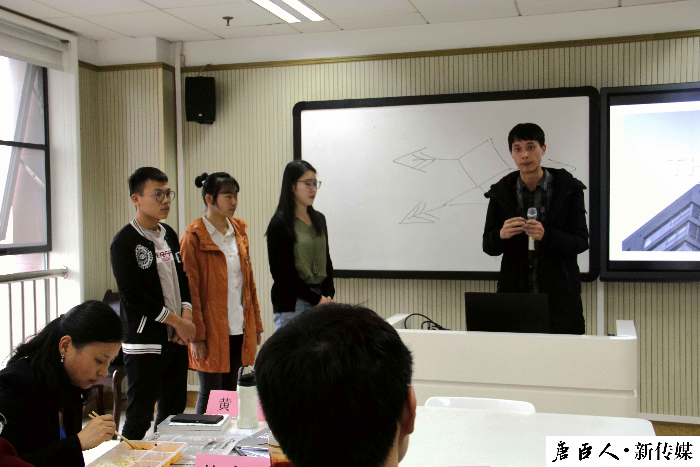 随后,课程小组第一组上台进行方案汇报。他们的方案名称为“零碎空间的多重利用”。几位不同专业的成员分别从方案构思、团队建设、材料使用、经费预算等方面进行介绍。新颖的构思方案吸引了老师的眼球。老师们根据其设计方案及用途提出建议,并对他们预算、设计等问题提出解决方案。