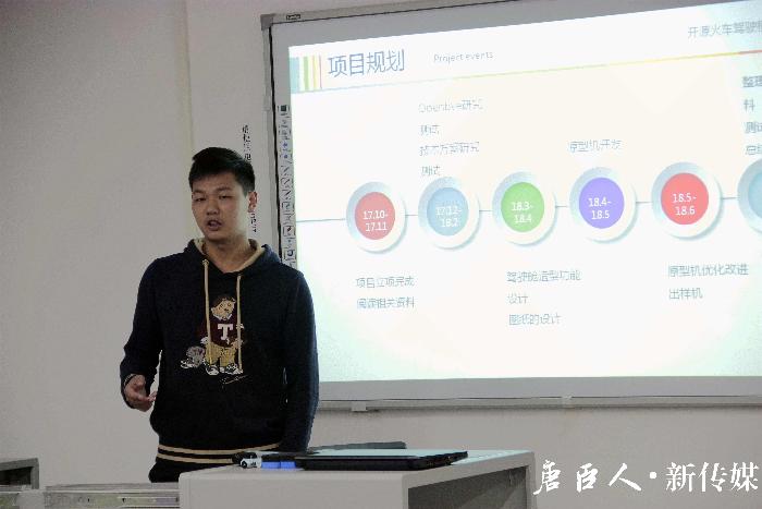 会议开始,主持人简短介绍后第一小组开始答辩。他们的科研项目是“‘唐臣人’卡通机器人设计”,由湛博同学进行答辩。小组共有两名成员,他们构想设计一个有简单语音交互系统的机器人为茅院同学提供便利。在老师提问环节,老师们建议要明确服务的程度,实现人—机器人—环境的良性互动。