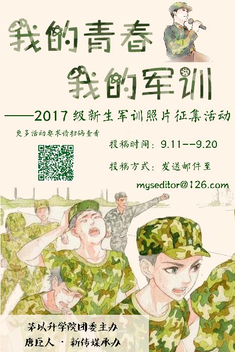 团委面向全体2017级新生举办“我的青春,我的军训”——军装照征集活动。如果你想向同学、老师、家长展现你军训的风采,想记录你大学生活中最帅、最美的那一个瞬间,来吧,报名加入我们,向众人展示你的青春!