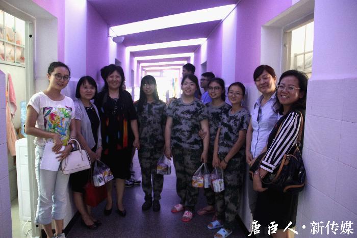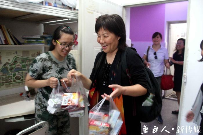 冯院长一行先是与班导生来到二楼女生寝室慰问,其间冯院长关心了班导生的学习情况,对他们的努力给予了充分的肯定。见到冯院长,同学们感到非常的惊讶与感动。冯晓云院长、栗民书记、郝莉副院长、王霞老师亲手将慰问品送给准备午休的同学们。领导老师们甚至与同学们亲切合照。同时,冯院长亲切的问候了同学们军训的情况,并赞扬了他们意气风发的军训状态。冯院长说:“我早上散步,听到他们喊口号的声音,都会感到热血沸腾。”