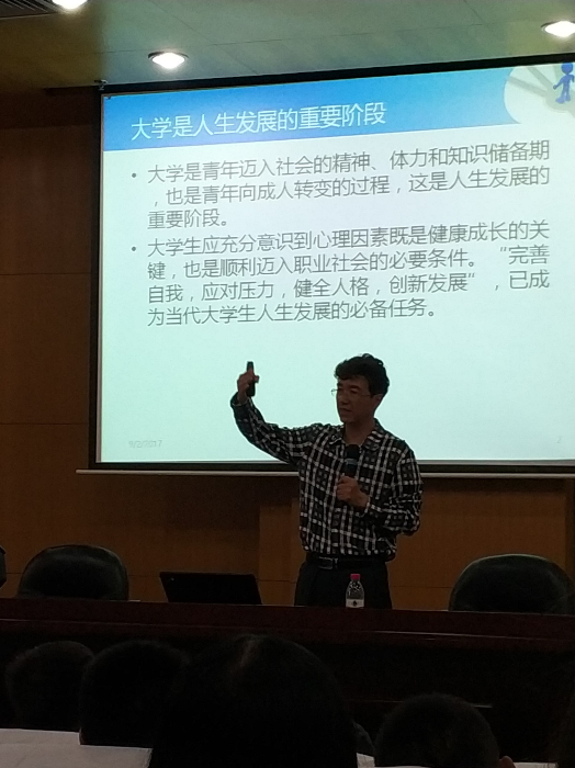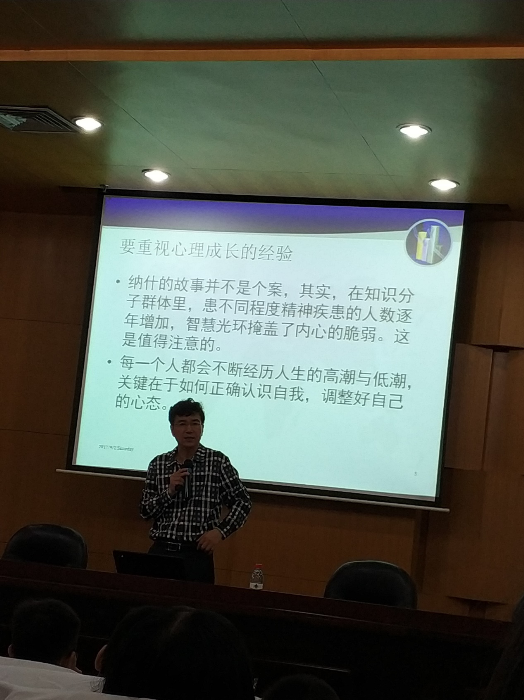 随后,宁教授通过总结美国著名经济学家、诺贝尔经济学奖得主、电影《美丽心灵》原型约翰·纳什的精神疾患经历告诉大家,每个人都会经历人生的高潮和低潮,关键在于如何认识自我,调整好自己的心态。宁教授指出,同学们要突破自我消极、把握良性自尊、消除嫉妒。要处理好与电脑(网络)、老师和同学的关系。通过正视心理问题,完成发展任务和做好角色扮演来增强自信、勇敢开掘内心的财富。