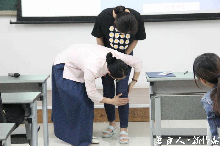 随后,唐静老师为同学们介绍了十二时辰养生,通过子午流注图让同学们了解到我国古代中医圣贤的智慧与经验,学习了在不同的时辰我们遵循自然规律来调养身体的方法。此外,唐静老师还针对具体的身体疾病,对应身体穴位图亲身示范,教授同学们敲打胆经、打通胃经等方法。