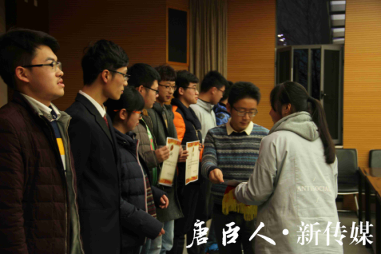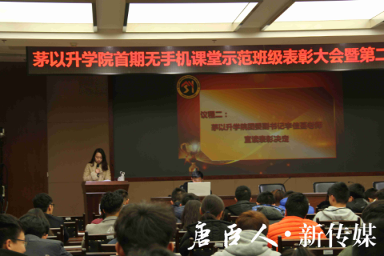 会议议程第二项,李佳蔓老师宣读了表彰决定,对在首期活动中积极申报并圆满完成任务的茅院2015级交运、电气、机械、土木、数学、力学、材料、金融,2016级信息、中文、土木、金融、电气、力学、交运、机械、材料共十七个班级授予“无手机课堂示范先锋班级”荣誉称号和奖状,以兹鼓励。毛盾老师为十七位示范先锋班级的代表依次颁发了奖状。在激昂的乐曲中,全场报以热烈的掌声。