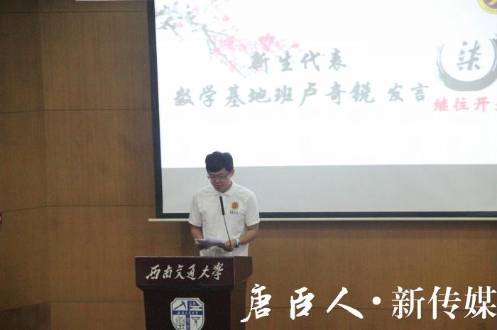 第二项,新生代表、数学基地班卢奇锐同学发言。卢同学希望自己和各班同学们可以携手共进,同创辉煌,以梦为马,不负荣誉。