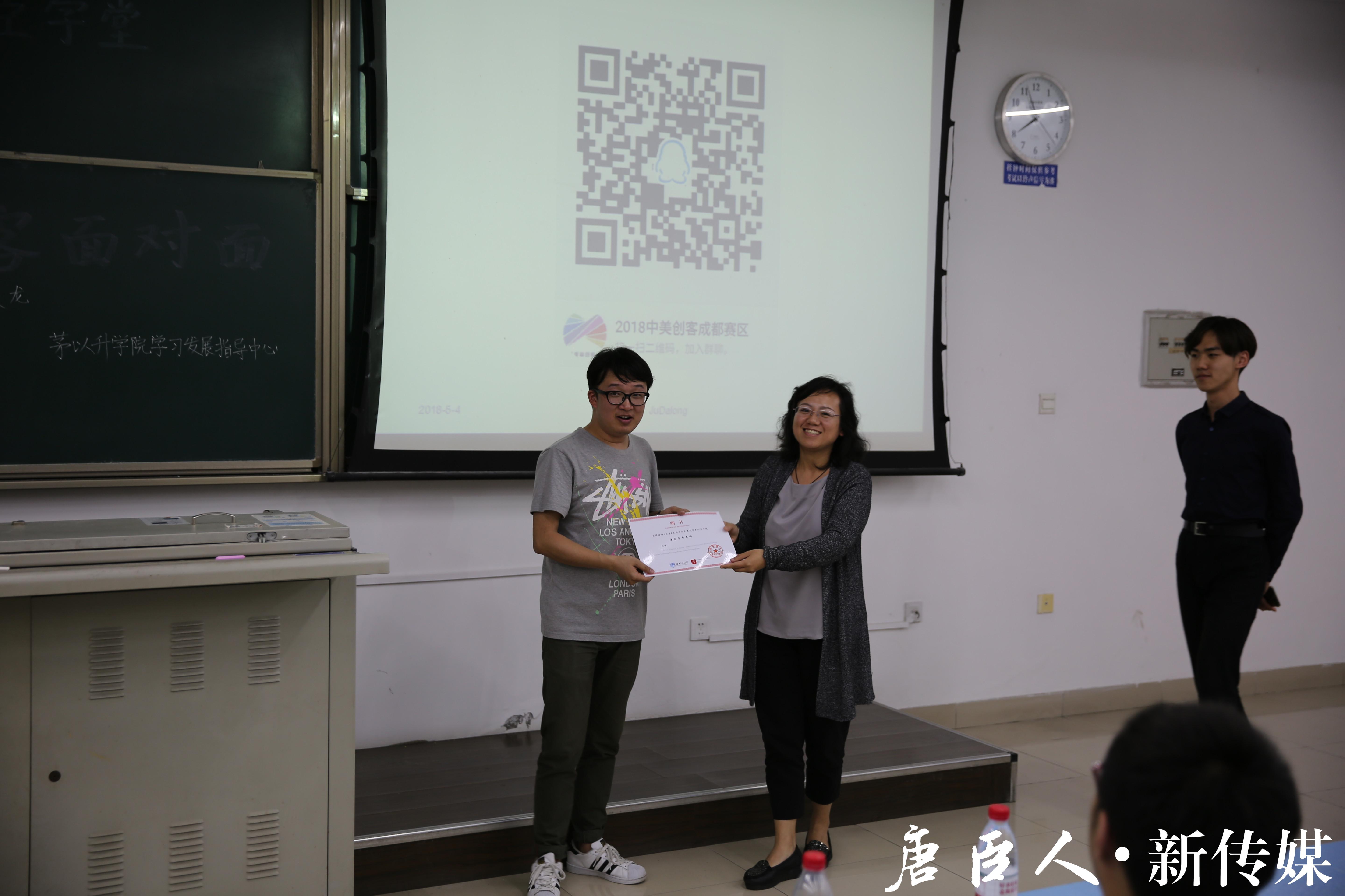党总支副书记、学生工作组组长王霞老师向主讲人鞠大龙董事颁发了“唐臣学堂导师”的荣誉聘书。至此,第二十三期唐臣学堂“中美创客面对面”宣讲会圆满落幕。愿即将到来的2018年中美青年创客大赛成都分赛区选拔赛顺利举行,也预祝各位参赛同学取得佳绩。