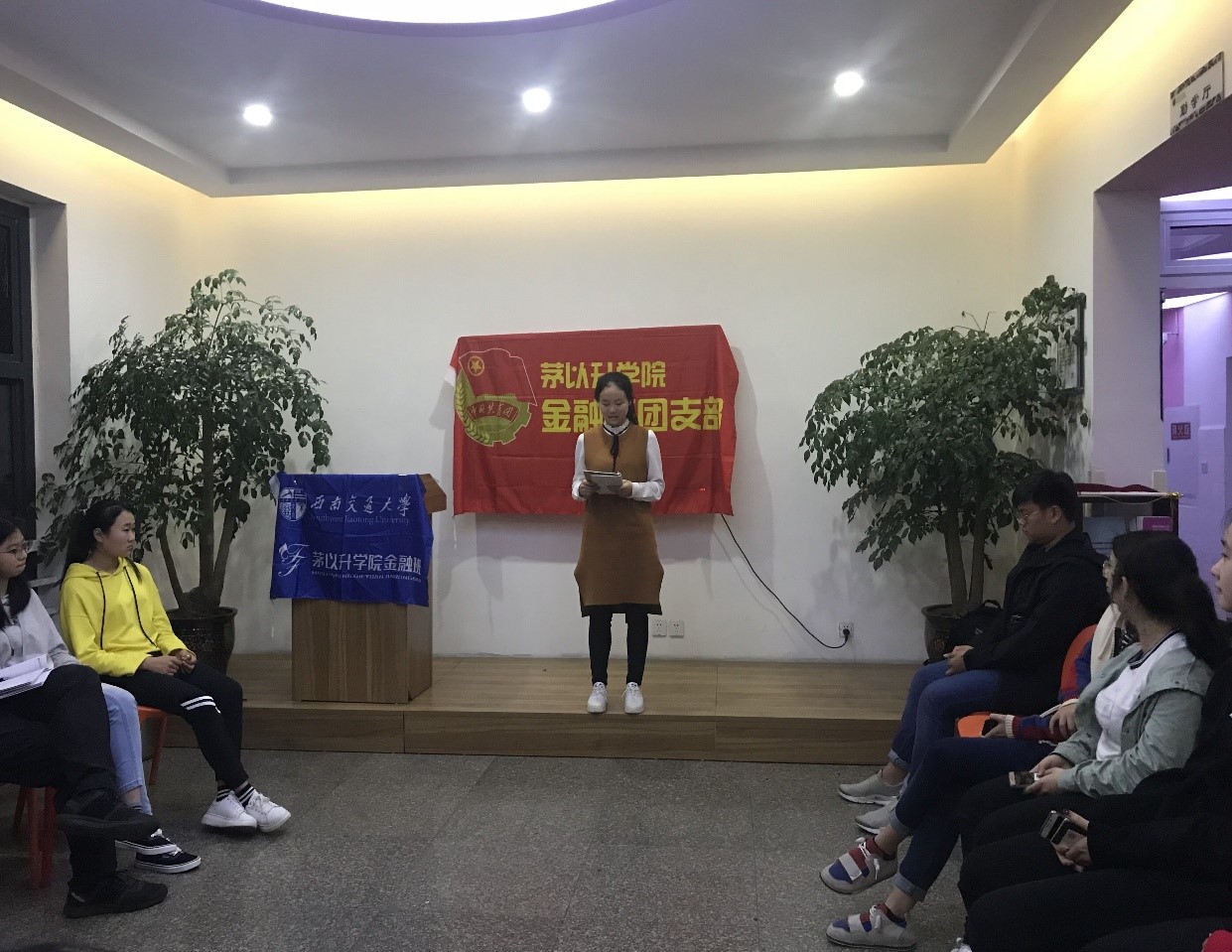 班会部分结束后,团会开始。团支书王帷韬总结了季度思想汇报提交的问题,他讲到,提交入党申请书后各位同学应该有自觉向党组织靠拢的觉悟,每个季度写一篇思想汇报是一个非常好的自我审视和思考的机会,同学们应该以更加积极的态度对待思想汇报。接下来,王帷韬向同学们传达了共青团西南交通大学第二十二次代表大会的精神。在上学期中,金融班与中文班联合举办的“此时无声胜有声”交通公益志愿活动就充分响应了团委“实践育人”的号召,以志愿者内心认同为源动力,以校地合作为基础平台。与此同时,校图书馆方面也充分认可了该志愿活动的成效,并热烈欢迎金融班与中文班在本学期继续开展该活动。通过征集同学们的意愿,金融班在本学期也会继续进行此次交通公益活动,以服务同学、服务大众的初心为学校作出自己的贡献。他也提到,“第二课堂”是我们应当予以重视的部分。我们必须按照学院的要求,积极参加各模块的第二课堂活动,使自己得到全方面的培养和发展。