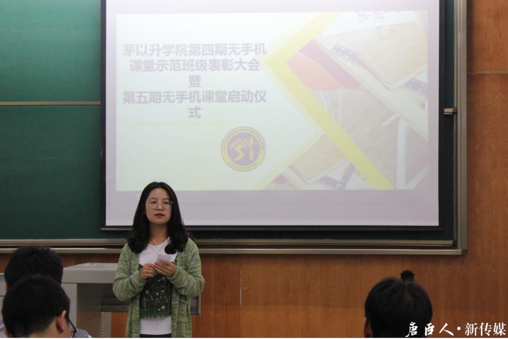 第五期“无手机课堂”正式启动,张莹霞老师上台致辞。张莹霞老师表示,“无手机课堂”这一活动举办的初衷是为同学们营造一个更良好的课堂学习环境。从活动开办至今,她看到越来越多的班级与同学能够积极参与到这个活动中来,认识到专注的重要性,积极配合。现在,“无手机课堂”活动成效显著,各班踊跃参加,得到了领导老师同学们广泛的肯定与认可。她也祝愿 腐漫画