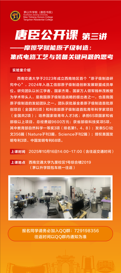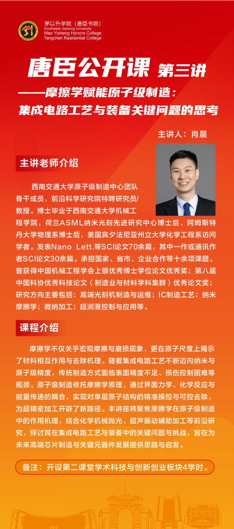《唐臣公开课第三讲——摩擦学赋能原子级制造:集成电路工艺与装备关键问题的思考》即将开课啦