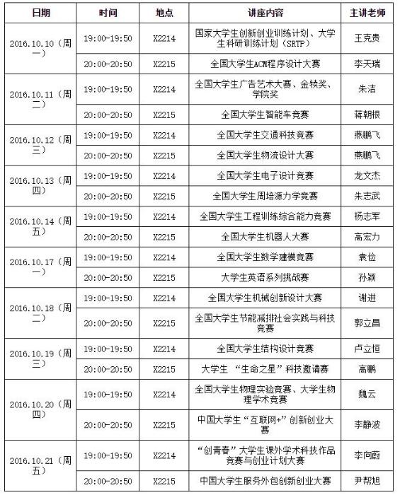 实践教学,推进创新创业教育,营造校园科创的学术氛围,让学生更全面的了解并积极投身实践大学生各类学科竞赛及创新创业活动,由西南交通大学教务处主办、西南交大创新创业俱乐部承办的 2016—2017学年第一学期学科竞赛及创新创业活动讲座活动于10月10日—21日举行。
