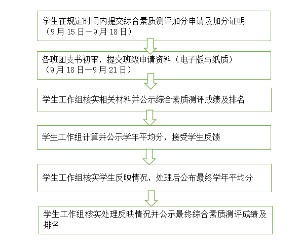 2、原则上,未提交《综合素质成绩评定表》的同学,视作放弃学年奖学金申请。请同学们务必积极提交(即使综合加分为0也需要提交),连同证明材料于9月18日17:30前交至团支书处进行第一轮审核。团支书根据评定细则进行审核,对于符合细则的加分申请予以通过,不符合者直接打回,并以班级为单位填写《综合加分汇总表》(附件3)。