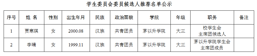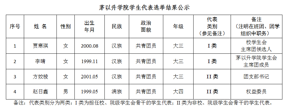 根据《关于做好西南交通大学第三十次学生代表大会筹备工作的预通知》相关规定及学院代表名额分配要求,经班级(团支部)推荐、学院学生会组织召开学生的代表会议选举,共选举出学生代表4名;由学院团组织提名、经班级(团支部)推荐、学院团组织考察,推选出学生委员会委员候选人2名。现将代表选举结果、委员候选人推荐名单公示如下。