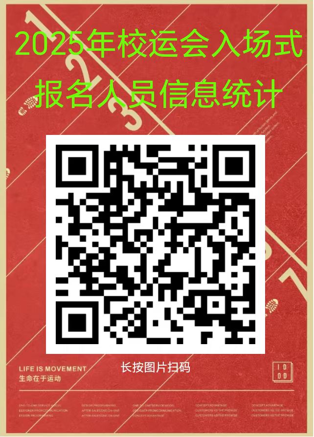 线上报名:2025年3月14日—2025年3月21日,扫描下方二维码填写报名信息,并加入活动QQ群:914408609。学院将从报名人员中遴选入场方阵运动员。