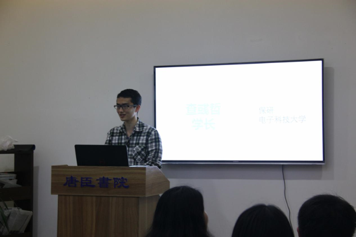 与李玥同学讲解的内容不同,已经报送到电子科技大学的查彧哲同学在讲解中回顾了自己的四年大学生活。他说道,四年时间飞逝,如果时间可以重来,他希望自己在努力学习的同时,能多参加社团活动,科研实践和学科竞赛。同时,他也鼓励在座的各位同学应该在四年生活中多做一些自己真正想做的事情来丰富自己的大学时光。