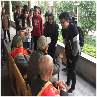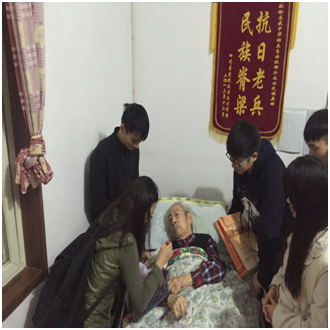 适逢周末,大多数老兵都已被家人接回家,养老院内还有五位老兵。当我们走进大厅时,一幅幅鲜红的锦旗立即映入眼帘,“抗日老兵,民族脊梁”、“抗战老兵,国之柱石”。一番致意后,我们为老人们送上了营养品、生活用品和学校纪念品。老人们拉着我们的手,先是对我们的到来表示欢迎,然后便各自说起了烽火岁月里的故事。