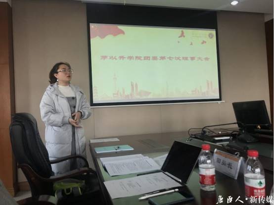 紧接着进行的是团委第七次理事大会,由各组织、服务中心及办公室指导老师对所负责的部门进行工作总结汇报。随后毛盾老师对本学期团学工作进行了总结:毛盾老师首先肯定了学生组织对学院工作推进等方面的重要作用,表扬了同学们对学生工作的热情和做出的努力,随后总结本学期学生工作中遇到的困难和改革的成果,提出全体学生工作者要适应新的要求,落实好计划,成果要经得起检验,并预祝同学们期末取得好成绩。