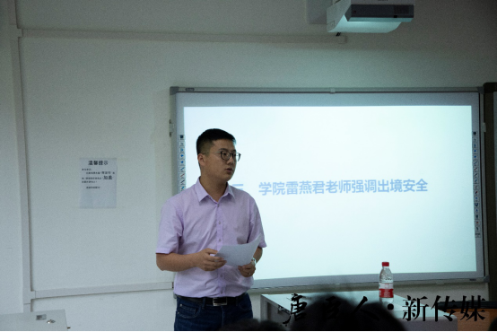 接着,雷燕君老师向同学们进行了更具体的安全教育。他的讲话内容中,安全也分为两部分——人身财产和思想安全。在人身财产安全教育中,他重点指出,不要为陌生人捎带物品、不要因过分的好奇心而去不安全地区探索、不要随意拾捡路边遗物、不要参与宗教政治活动、走私外汇交易等,并细致讲解了常见突发情况的应对措施;在思想安全教育中,他要求同学们注重自身行为准则、规范社交礼仪。经过雷老师的讲解,同学们对安全要求有了更深刻认识。