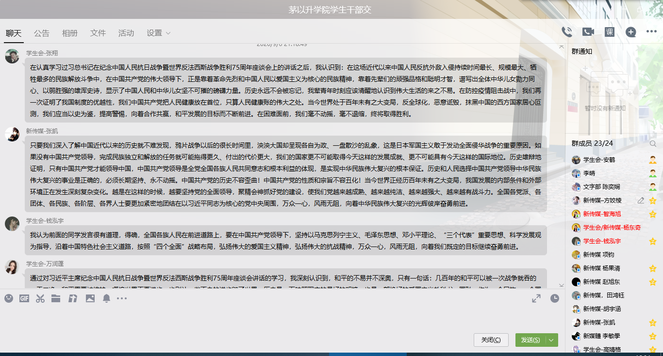学生干部成立学习小组,组织小组成员学习习近平主席在纪念中国人民抗日战争暨世界反法西斯战争胜利75周年座谈会上重要讲话精神,传承抗战信念,激励时代进步。活动以线上形式进行,由 腐漫画