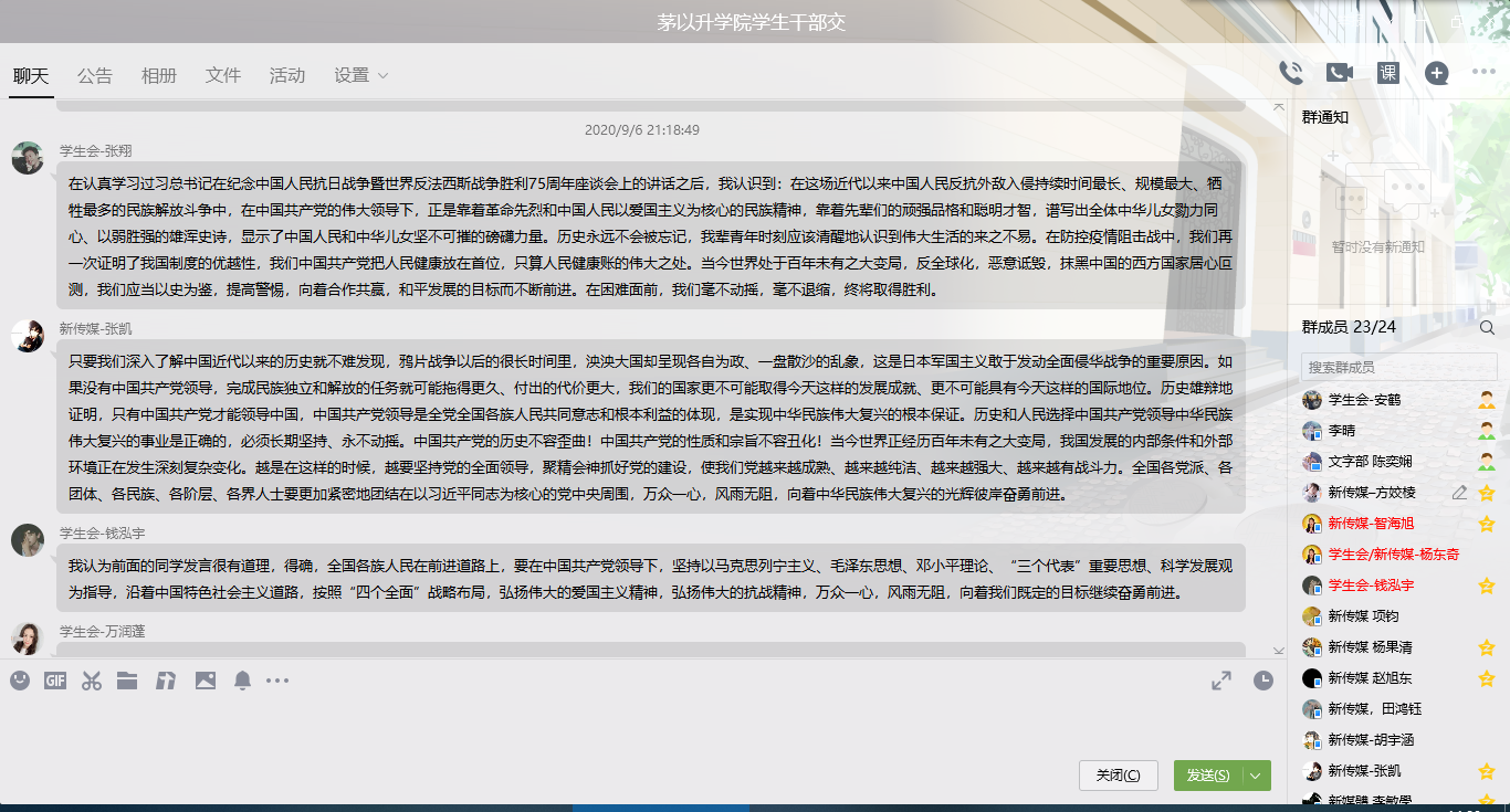 还有成员谈到,对于我们这一代人而言,2020年的新冠疫情就是一场“战争”,和抗战一样成为中华民族必然面临的大考,战争中英勇牺牲的战士和疫情中无悔奉献的医务工作者都是英雄。所以,一个民族、一个国家想要复兴,必然要从危难中总结经验教训,用实实在在的努力提升自身的综合实力,掌握更多话语权。