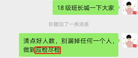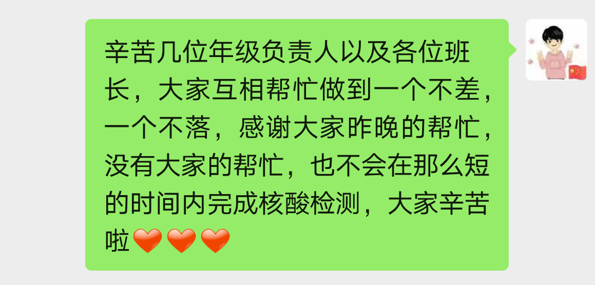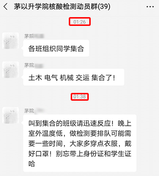 辅导员们提醒各班班长 ,一定要通知到班级所有成员参加核酸检测,坚持不落下任何一个人,做到所有茅院学子应检尽检。