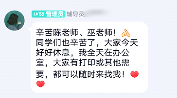 采取深入学生宿舍开展学生工作的方式,辅导员们全都入驻书院办公,全天在办公室,始终坚守“灯常亮、门常开、人常在”的工作要求,为受疫情影响没有打印四六级准考证的同学提供便利的打印服务。