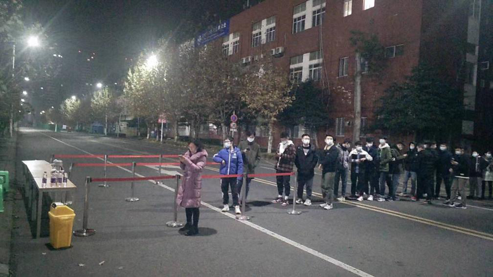 夜色中,医护人员严阵以待,同学们在辅导员的组织下有条不紊地排起了长队,静默有序地进行核酸检测,积极配合着医护人员的工作。