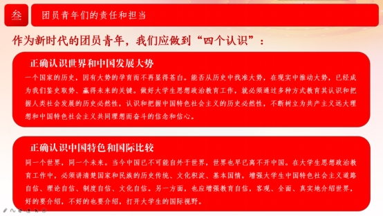 第三部分是团员青年们的责任和担当。王欣同学勉励全班同学,作为新时代的团员青年,我们应做到“四个认识”:正确认识世界和中国发展大势;正确认识中国特色和国际比较;正确认识时代责任和历史使命;正确认识远大抱负和脚踏实地。同时,增强“四个意识”,坚定“四个自信”,坚决做到“两个维护”,也是我们当代青年的义务和重任。