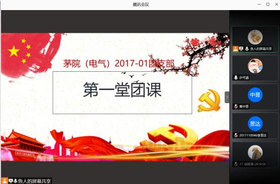 2020年10月17日晚上九点,茅院(电气)2017-01团支部开展了秋季学期“第一堂团课”活动。本次团课茅院(电气)2017-01团支部参与总人数21人,以线上会议的形式展开,学习总共分为三个部分,首先是合唱共青团团歌,接下来是集中学习青年大学习,最后关于迎接中国共产党100周年诞辰的学习的讨论。总时长40分钟。