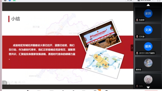 在后续线上的腾讯会议中,团支部书记朱宇华对《带你走近“成渝地区双城经济圈”》PPT进行了一番细细的讲解,同学们观看过后也深有感触,在聊天窗口展开了热烈的探讨。随后大家一起观看了《团团说唱节约美德》视频,许多同学分享了自己知道的一些环保语录和环保小窍门,大家的环保意识也在点滴间得到了深化。