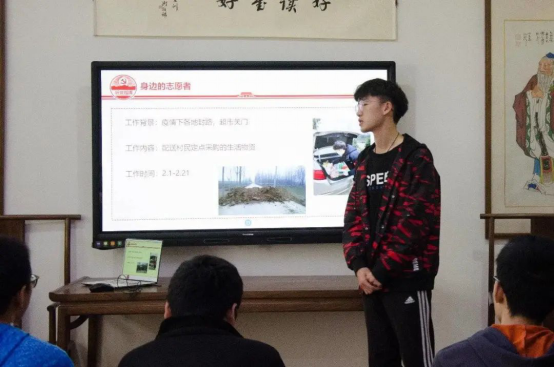 之后,在疫情期间作为社区采购员的杨冬晨同学向全班同学讲述的自己的志愿故事:自掏腰包为村里的贫困户买生活物资。用身边的真人、真事和真情实感促使同学树立见贤思齐、奋斗成才的价值导向,激发同学珍惜韶华、永续奋斗的精神状态。